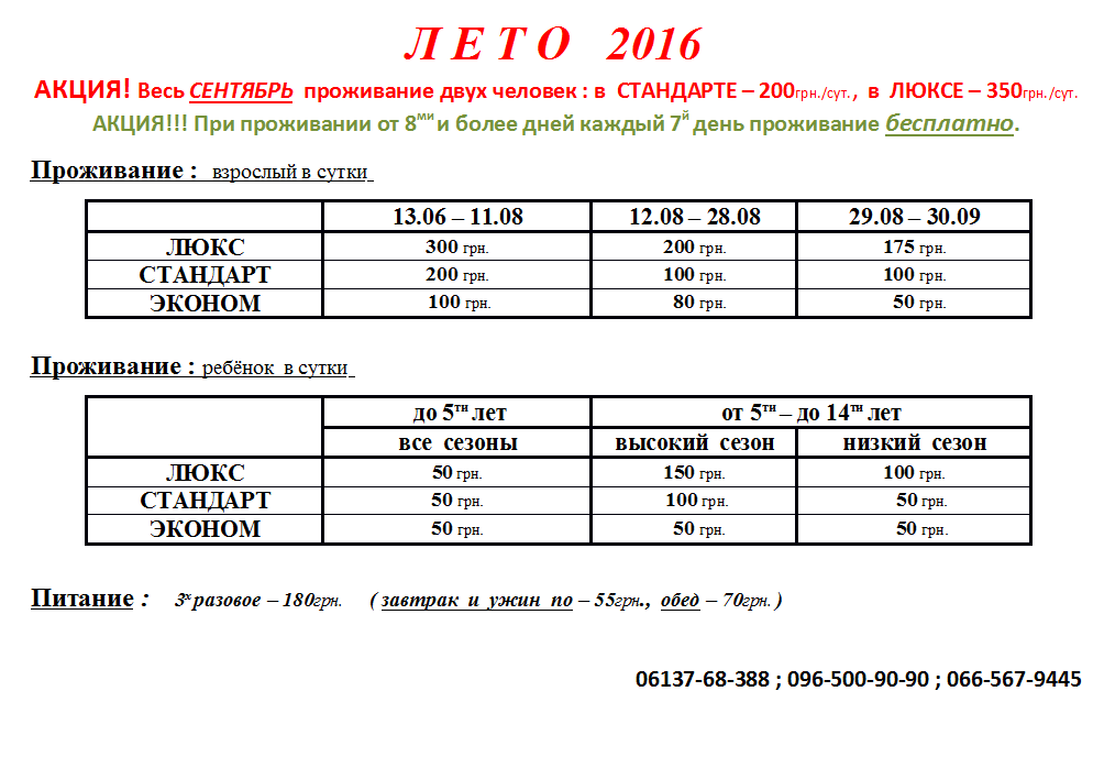 Возможно проживание в номерах "стандарт" и "люкс" с самостоятельным приготовлением питания. Дополнительная информация по стоимости проживания в этом случае по контактным телефонам.